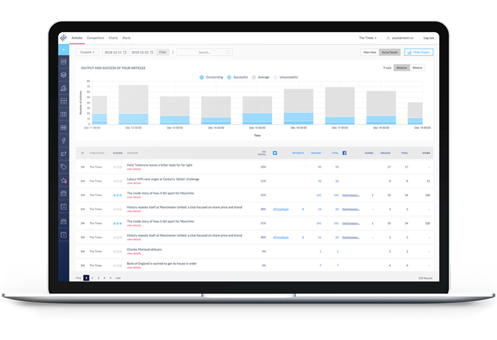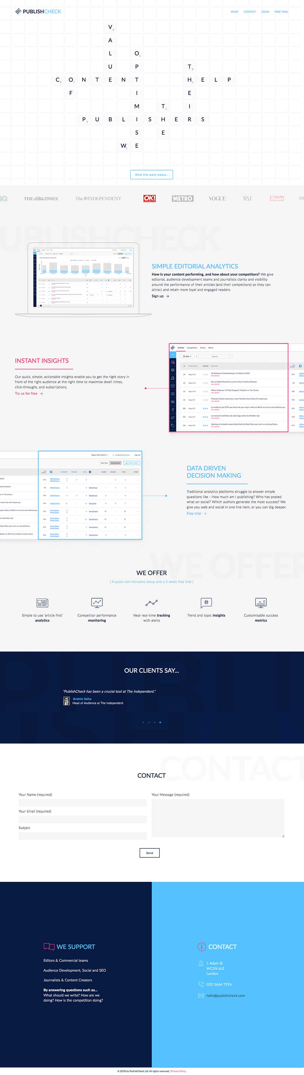 PublishCheck is an analytics platform designed for news-stand publishers such as Vogue, The Sun, GQ and many others. It gives audience development teams insight into how articles are performing and guides next steps to glean more readers. We designed and built everything you can see and touch from brand through to code, all animations and intricate dashboards. A labour of love.